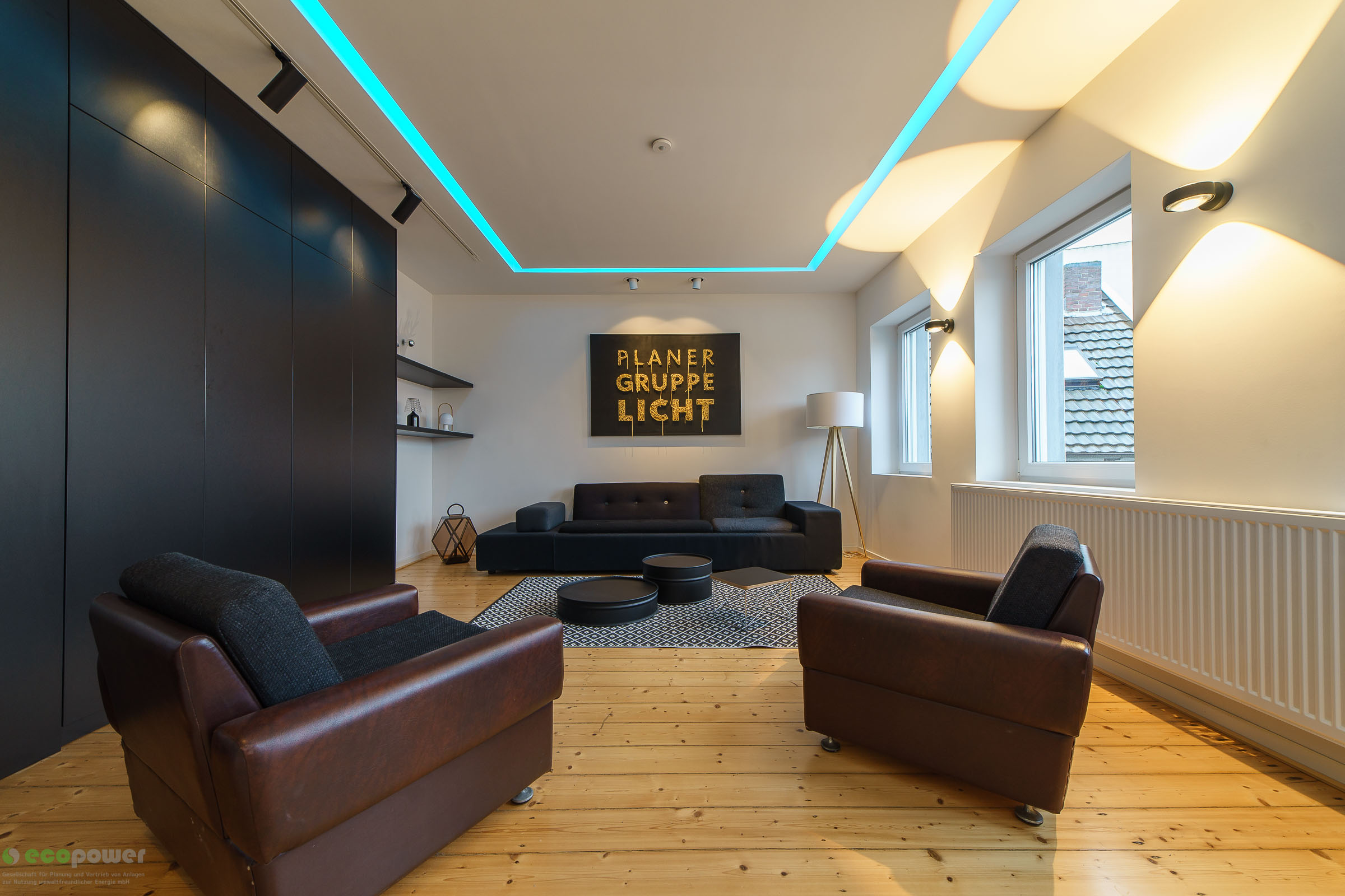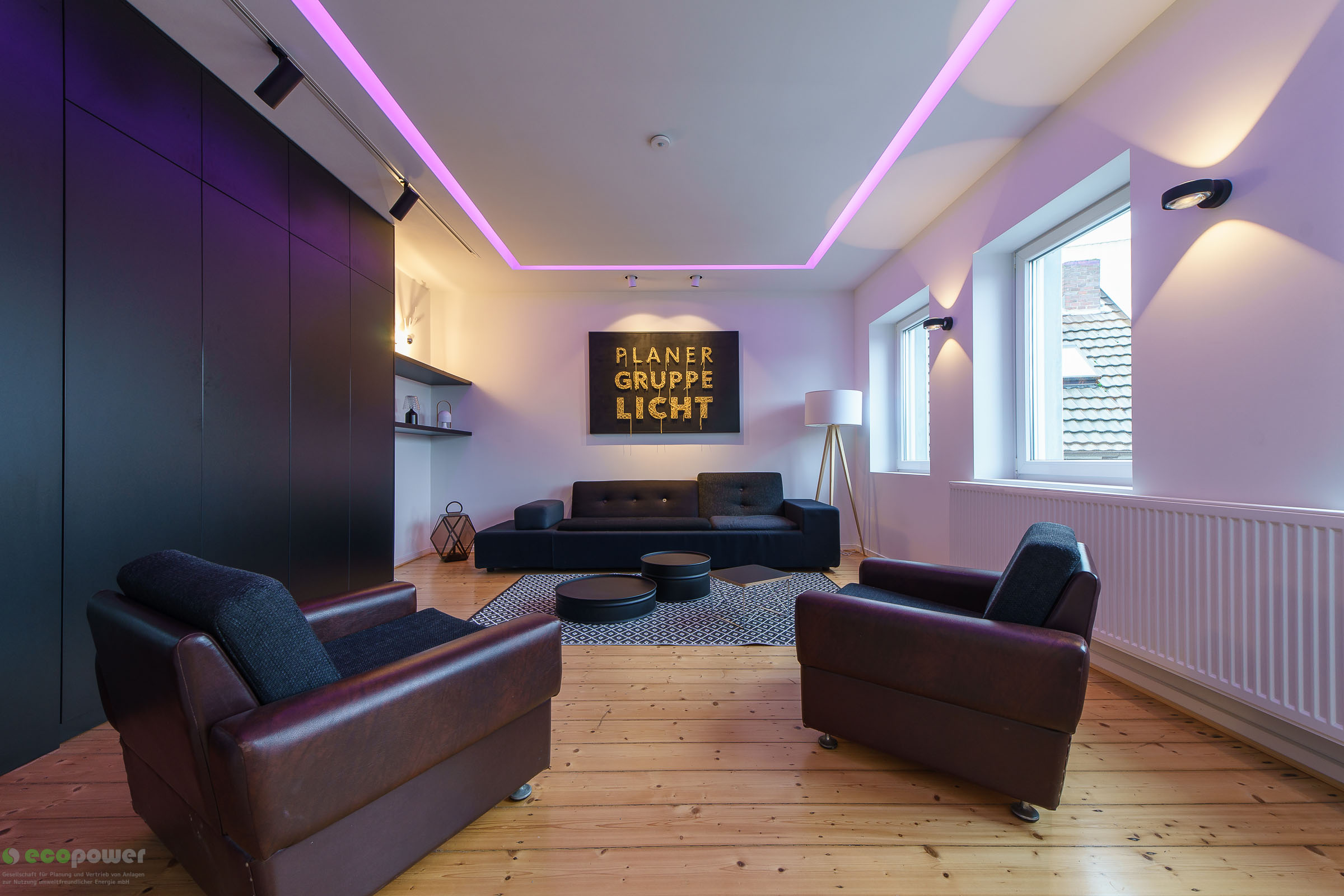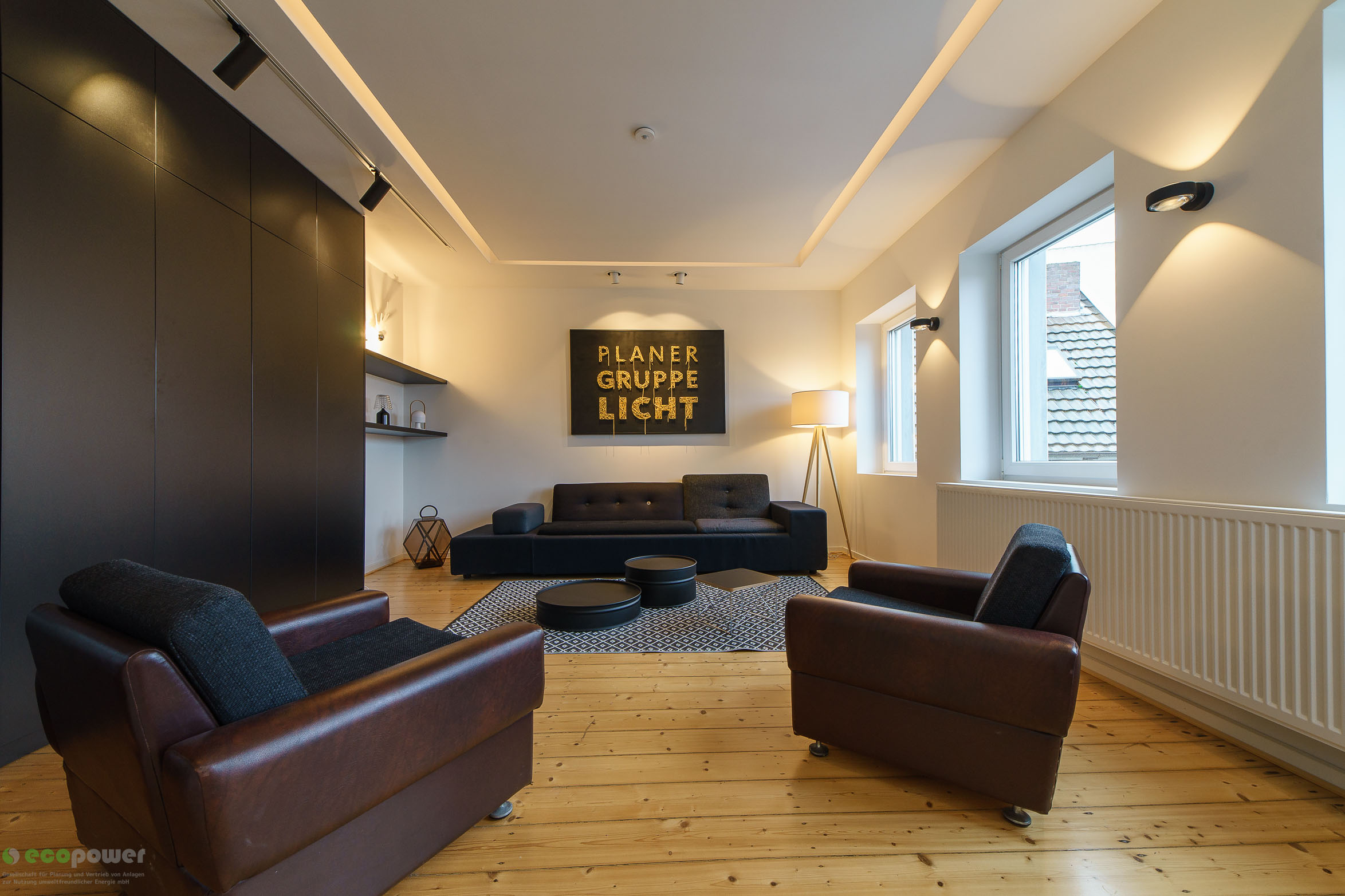 Auch die erste Etage direkt über den ecopower-Räumlichkeiten wurde im Zuge einer Kernsanierung mit smarter Haustechnik von Loxone ausgestattet und gemeinsam mit Lichtplaner Holger Hüpen zu einer waren Wohlfühloase umgebaut. In dieser Umgebung fühlen sich nicht nur die Mitarbeiter der Planergruppe Licht wohl, sondern auch unsere Kunden, welche sich bei einem kleinen Rundgang durch die Räumlichkeiten, häufig das erste Mal mit dem Thema Lichtkonzept konfrontiert sehen.